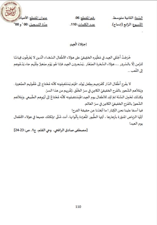 نص إجتلاء العيد للسنة الثانية متوسط الجيل الثاني